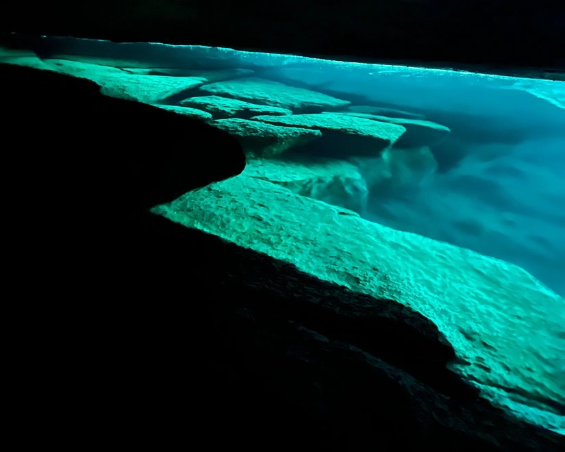E na 4ª parada chegamos na Gruta do Acaiá. Essa caverna impressionante é cercada por águas cristalinas e rochas imponentes. Ao adentrar a Gruta, você será recebido por um ambiente misterioso e fascinante. O interior da caverna é bem estreito, e por esse motivo o uso de capacete esportivo é fundamental para sua segurança. A beleza das formações rochosas é ampliada pelas águas cristalinas que refletem a luz, criando um espetáculo visual único. Essa diversidade biológica torna a experiência de explorar o local ainda mais especial, permitindo que você aprecie a interação entre o mundo subterrâneo e o mar.