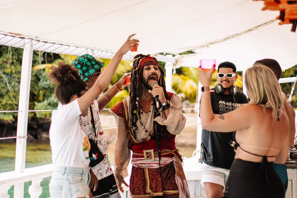 CAIPIRINHA TOUR é tradicional da Ilha Grande, sem dúvidas o passeio mais animado da região e conhecido pela caipirinha MA RA VI LHO SA que é liberada durante todo o dia. Dizem por aí que é a melhor do Brasil. Vocês já ouviram falar do Capitão Jack Angra? Ele é o comandante de toda nossa diversão.